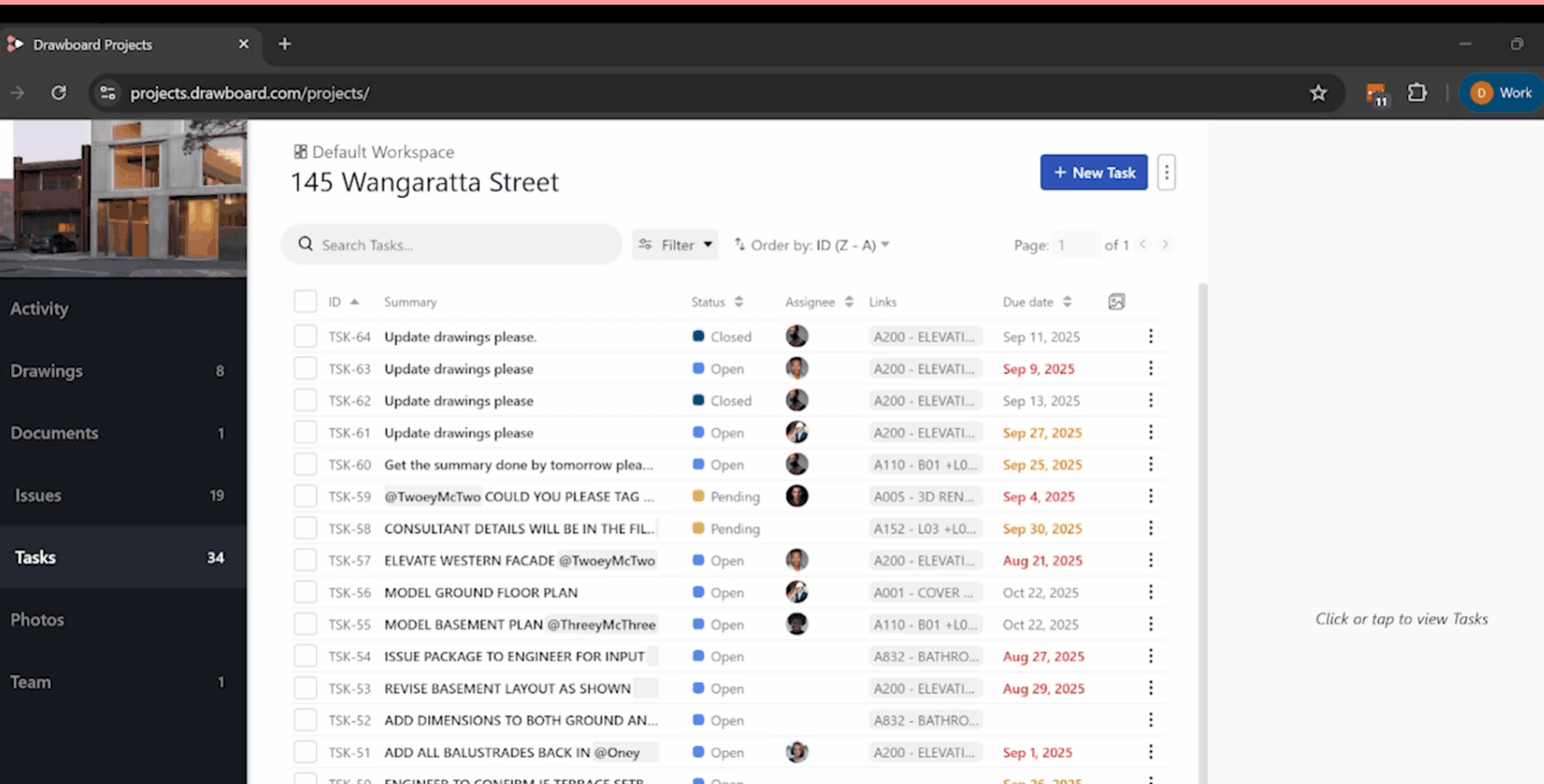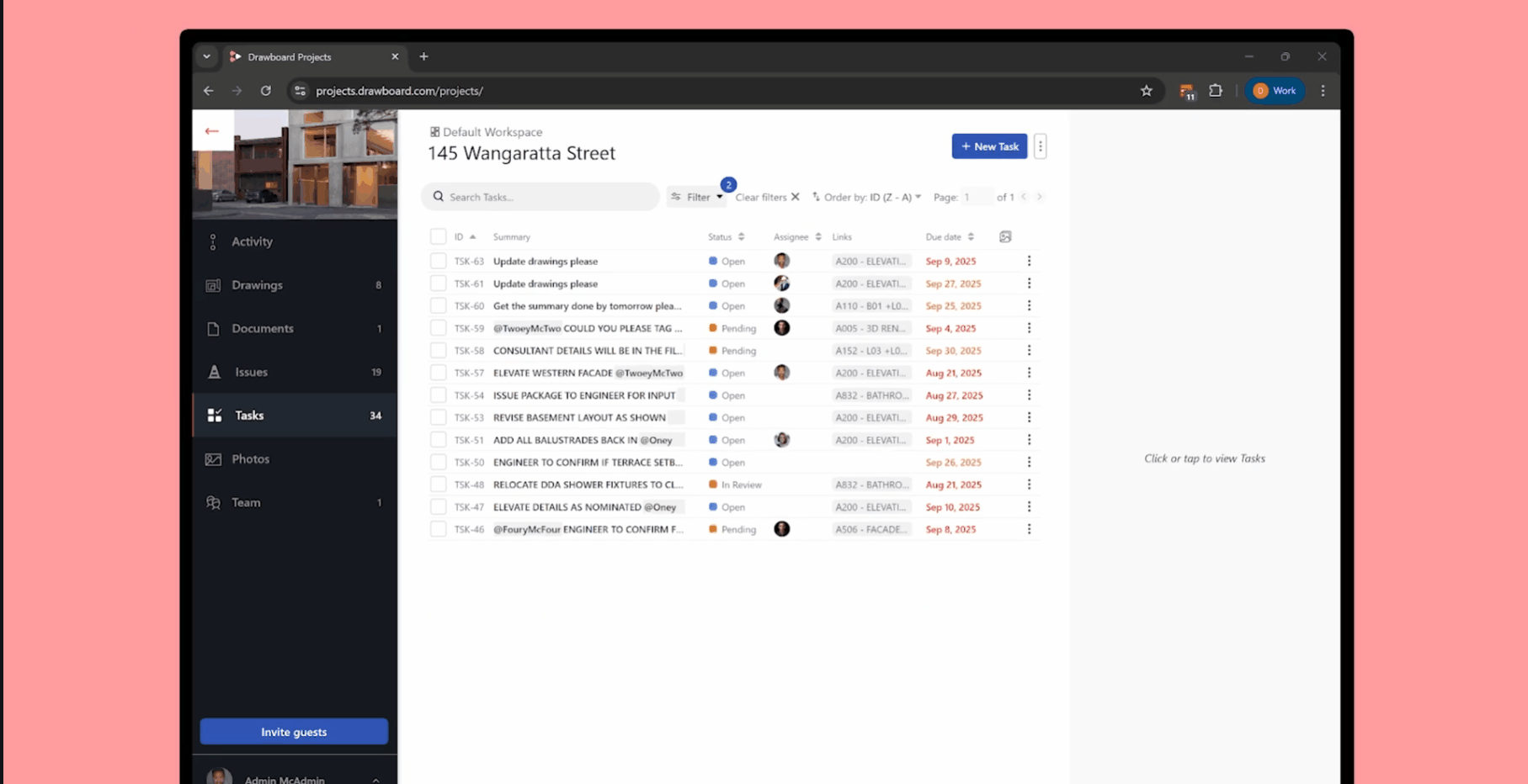 It doesn't have to work that way. Drawboard Projects keeps coordination in one place, with feedback anchored directly to the drawings where decisions are made. Markups and comments sync in real time across every discipline, so nobody is reacting to yesterday's version. Follow-ups become Tasks pinned to the exact location on the drawing that created them, with an owner, a due date, and a status that updates as work moves forward.