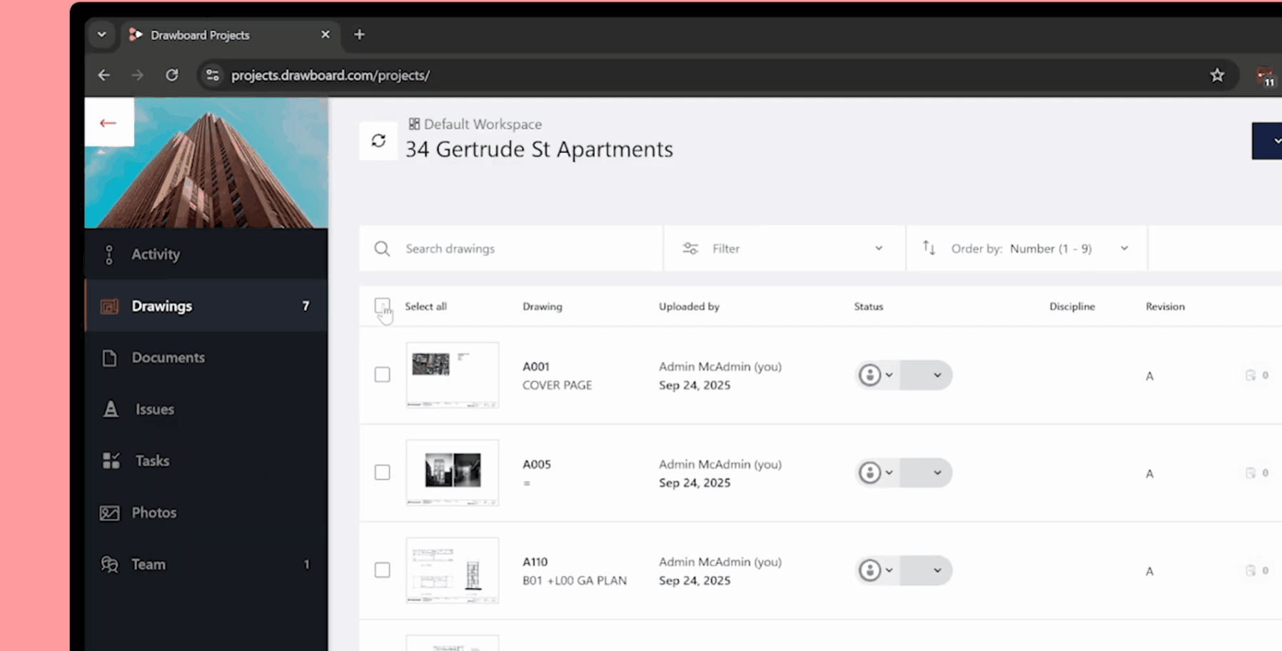 Once the project exists, upload the drawings and supporting documents, then use bulk actions to apply review statuses and assignments across the set. The objective is to make the package review-ready quickly and consistently, so reviewers can open the project and start immediately without asking which sheets they own or what’s still outstanding.