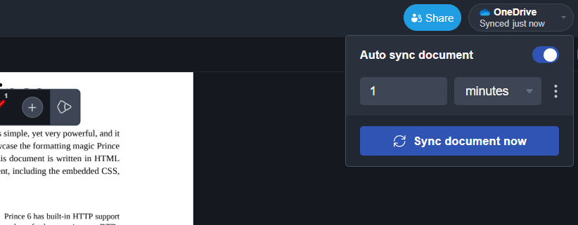 Inside the editor, use the sync controls in the top-right corner to manage how updates are saved back to OneDrive. From here, you can adjust how often syncing occurs, manually push changes, or disable syncing if needed.
