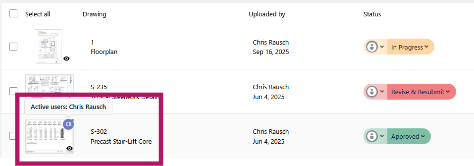 Example: A project coordinator is preparing for an afternoon review and wants to confirm the lead engineer has looked at the updated structural drawings before the session starts. Rather than sending a message, they check the drawing list, see the engineer's avatar on the relevant sheets, and know the review can proceed as planned.