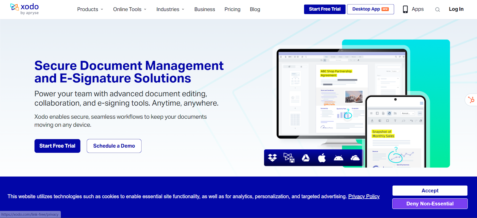 Depending on your plan, Xodo scales from basic browser tools to a full desktop editor. The desktop version adds OCR, redaction, and form creation, while the top tier combines web, desktop, and mobile access with syncing and limited AI-assisted features. Cloud integrations with Google Drive, Dropbox, and OneDrive make it easy to open and annotate files wherever you are, and e-signing is available through Xodo Sign for an extra fee.