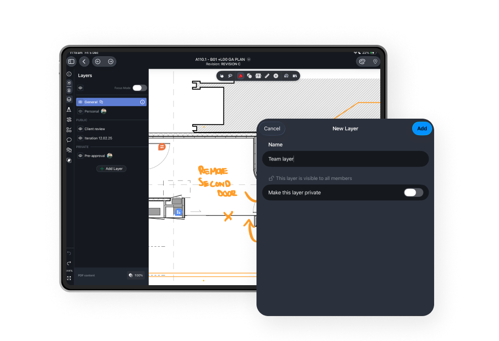 Toggle markup layers or isolate individual contributors to keep drawings easy to read, reduce clutter, and focus on the information that matters.